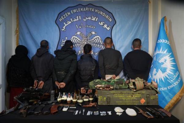 وأضاف المركز الإعلامي “ضِمن سلسلة المتابعة وملاحقة ملفات ترويج المخدرات من قبل قواتنا، توصل أعضائنا في مكافحة المخدرات لستة أشخاص يعملون في ترويج المواد المخدرة في مدينة قامشلو، وبعد جمع الأدلة والثبوتيات التي تثبت تورطهم تم التنسيق مع النيابة العامة لمداهمة أماكنهم وإلقاء القبض عليهم بالتنسيق مع قوى العمليات كما ضُبِطَ بحوزتهم أثناء المداهمة الأسلحة والمواد التالية: