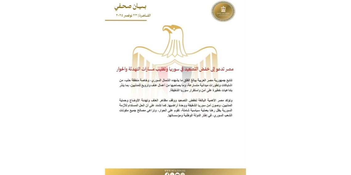 دعت جهورية مصر إلى خفض التصعيد في سوريا وتغليب مسارات التهدئة والحوار، مؤكدةً متابعتها ببالغ القلق للتطورات في مدينة حلب، في ظل اشتباكات ميدانية متسارعة وما يصاحبها من أعمال عنف وترويع للمدنيين، بما ينذر بتداعيات خطيرة على أمن واستقرار البلاد.